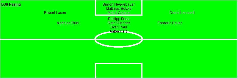 DJK Pasing: Simon Neugebauer - Robert Lacen (82. Lukas Jung), Matthias Butzke, Mehdi Astane, Denis Leoncelli (76. Roman Pasternak) - Phillipp Fuss - Matthias Rühl (46. Christoph Scheitterlein), Reto Buchner, Sven Paul, Frederic Goller - Anton Hartl Tore: 0:1 (18.); 0:2 (32.); 0:3 (78.) Die DJK Pasing muss die erste Heimniederlage der laufenden Saison gegen den Sportverein aus Laim hinnehmen. Das Spiel nahm von Anfang an Fahrt auf und durch ein Missverständnis der Laimer Abwehr stand schon nach fünf Minuten Sven Paul alleine vor dem Gästetor, scheiterte jedoch am Pfosten. Die Laimer agierten effektiver und verwandelten nach einer Viertelstunde einen direkten Freistoss aus halbrechter Position über die Mauer ins Eck. Kurz darauf tauchte wiederum Paul am Sechzehner des Sportvereins auf, doch seinen Volleyschuss konnte der Torwart parieren. Und wieder war es das Gästeteam, das kaltschnäuziger vor dem Tor blieb und einen Abpraller per Nachschuss in das 2:0 ummünzte. Das Spiel verlief weiterhin offen und so kam Toni Hartl kurz vor dem Pausenpfiff zu seiner Möglichkeit, aber auch sein Schuss flog am Tor vorbei. Mit umgestellter Formation versuchte die DJK nach der Halbzeit nun den Spieß noch einmal um zu drehen. Das Tor der Gäste schien immer noch wie vernagelt, auch nach den Chancen von Goller und wiederum Hartl. 20 Minuten vor dem Schluss sah nun der Laimer Verteidiger nach wiederholtem Foulspiel die gelb-rote Karte, doch auch aus der Überzahl konnten die Pasinger keinen Profit schlagen. Laim erhöhte letztendlich nach einem Konter sogar noch auf ein drittes Tor. Den Schlusspunkt setzte Paul mit einem Flugkopfball, der typisch für diesen Tag, aus kurzer Distanz genau in den Armen des Keepers landete. Daraufhin pfiff der äußerst souveräne Schiedsrichter das Spiel pünktlich ab. |