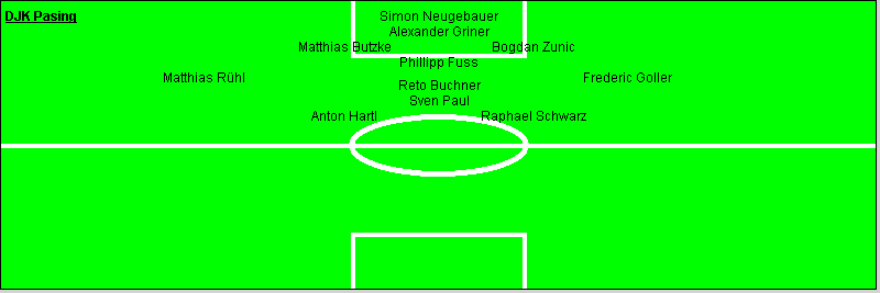 DJK Pasing: Simon Neugebauer - Matthias Butzke (77. Roman Pasternak), Alexander Griner, Bogdan Zunic - Matthias Rühl, Phillipp Fuss (80. Mehdi Astane), Frederic Goller - Reto Buchner (75. Robert Lacen), Sven Paul - Anton Hartl, Raphael Schwarz Kader: Denis Leoncelli Tore: 1:0 Anton Hartl (30. / Sven Paul); 2:0 Raphael Schwarz (40. / Anton Hartl); 3:0 Sven Paul (51. / Frederic Goller); 4:0 Raphael Schwarz (70. / Reto Buchner); 5:0 Raphael Schwarz (78. / Simon Neugebauer) Beim Rueckrundenauftakt gelingt der DJK Pasing ein ungefaehrdeter Heimsieg gegen den TSV Forstenried. Von Beginn an uebernehmen die Hausherren das Ruder und kommen ein ums andere Mal gefaehrlich vor das Gaestetor. Bedingt durch die mangelnde Chancenauswertung dauert es eine halbe Stunde bis die Kugel zum ersten Mal im Tor zappelt, als Hartl eine Hereingabe von Paul aufnimmt und den Ball aus gut zehn Metern ins rechte Eck bugsiert. Kurz darauf ist es Neuzugang Schwarz, der mit dem 2:0 die Weichen endgueltig auf Sieg stellt, nachdem sich Hartl bis zur Grundlinie durchgedribbelt und zurueckgelegt hatte. Kurz vor der Pause haben dann die Gaeste aus Forstenried ihre staerkste Phase, doch ihre beste Chance, ein Freistoss aus 30 Metern, landet nur an der Latte. Auch nach der Halbzeit behaelt Pasing die Kontrolle ueber das Spiel und legt mit dem 3:0 nach. Goller wird auf der linken Seite steil geschickt und legt quer auf den freistehenden Paul ab, der keine Muehe hat den Ball im leeren Tor unterzubringen. Die fruehe Vorentscheidung nimmt etwas die Luft aus dem Spiel, was den gut aufgelegten Schwarz nicht davon abhaehlt in seinem ersten Pflichtspiel fuer die DJK mit zwei weiteren Treffern seinen Hattrick perfekt zu machen, wobei ein Assist vom abermals starken DJK-Keeper Neugebauer kommt. Auf dieses Ergebnis kann in den naechsten Wochen aufgebaut werden |