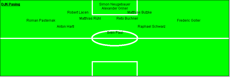 DJK Pasing: Simon Neugebauer - Robert Lacen, Alexander Griner, Matthias Butzke - Roman Pasternak (59. Mehdi Astane), Matthias Rühl (67. Marco Carvalho), Reto Buchner, Frederic Goller - Anton Hartl (82. Vassilios Agorastos), Raphael Schwarz - Sven Paul Tore: 1:0 Raphael Schwarz (9. / Matthias Rühl); 2:0 Sven Paul (59. / Reto Buchner); 3:0 Raphael Schwarz (70. / Sven Paul); 4:0 Vassilios Agorastos (84.) Verdienter Sieg für die DJK, welche an diesem Tag eine gute Chancenverwertung hatte. Der Sieg geht vielleicht etwas zu hoch aus. Hauptsache ist, dass die drei Punkte in Pasing bleiben und wir uns für das ganz schwache Hinspiel revanchieren konnten. |