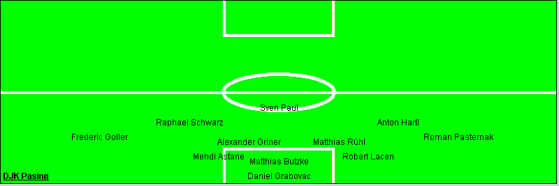 DJK Pasing: Daniel Grabovac - Robert Lacen, Matthias Butzke, Mehdi Astane (46. Bogdan Zunic) - Roman Pasternak, Matthias Rühl, Alexander Griner, Frederic Goller (70. Denis Leoncelli) - Anton Hartl, Raphael Schwarz - Sven Paul Tore: 0:1 Raphael Schwarz (24.); 1:1 (41.); 1:2 Sven Paul (52. / Matthias Rühl); 2:2 (67.) Wir haben es verpasst nach der zweimaligen Führung den Sack zuzumachen. So haben wir den Laimern immer die Chance gelassen das Spiel auszugleichen. Schade, dass der Schiedsrichter das klare Foul vor dem 1:1 gegen Butzke nicht gesehen hatte. In der Schlussphase des Spiels hätten beide Mannschaften den Siegtreffer machen können, scheiterten aber an Ihren Nerven oder den starken Torhütern. Unterm Strich leider nur ein Punkt gegen neuerstarkte Laimer. |