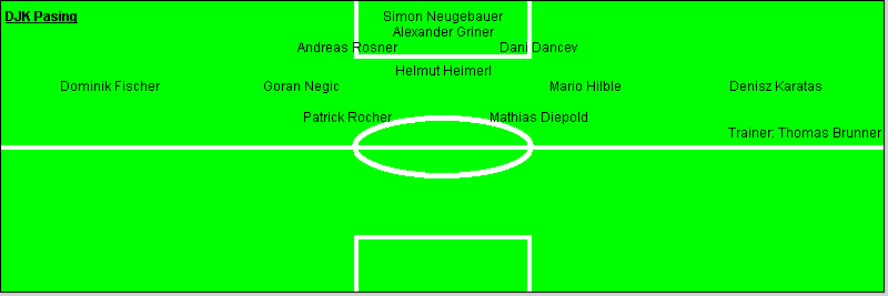 DJK Pasing: Simon Neugebauer - Andreas Rosner, Alexander Griner, Dani Dancev - Helmut Heimerl - Dominik Fischer, Goran Negic (75. Sven Paul), Mario Hilble, Denisz Karatas (80. Christian Groß) - Patrick Rocher (82. Stefan Forster), Mathias Diepold; Trainer: Thomas Brunner SV Pullach 2: Oliver Neukamm, Florian Jungwirth, Güc Tezer, Daniel Heiduk, Patrick Loewe, Isenrat, Alexander Bezold (33. Julian Wolf), Michael Jelic, Patrick Sill (75. Emanuel Riavez), Michael Bochning (69. Max Erhardt), Stephan Karl; Trainer: Kai Hintzer Tore: 1:0 Denisz Karatas (15.); 1:1 Michael Jelic (17.); 2:1 Mathias Diepold (57. / Dominik Fischer); 3:1 Alexander Griner (68. / Denisz Karatas); 4:1 Patrick Rocher (75. / Mathias Diepold); 5:1 Sven Paul (90. / Dominik Fischer) Vergebener Elfmeter: - / Patrick Sill (Foulelfmeter, 74.) Am 4. Spieltag empfing die DJK den Aufsteiger und Tabellenführer aus Pullach. Die Gäste kamen mit einer Bilanz von 9 Punkten und 4:0 Toren an die Agnes-Bernauer-Straße. Eine schwere Aufgabe für die DJK. Das Spiel war keine Minute alt und Patrick Rocher scheiterte mit seinem Versuch am Gästekeeper. In der 15. Minute wird Rocher gefoult. Denisz Karatas tritt den Freistoß aus halbrechter Position und zirkelt ihn ins kurze Eck. Bei dieser Situation machte der Gästekepper keine gute Figur. Nur zwei Minuten später fiel der Ausgleich. Eine Flanke von der linken Seite landet beim Pullacher Stürmer. Dieser köpft den Ball aus klarer Abseitsposition in das Tor. Danach neutralisierten sich beide Mannschaften weitgehend. Die Gäste standen weit in der eigenen Hälfte und warteten auf Konterchancen. Nach der Pause war die DJK dann druckvoller und schnürte die Gäste in ihrer Hälfte ein. Nach einer Ecke von Fischer köpft Diepold den Ball unbedrängt zur Führung ein. In der 68. Minute flankt Karatas auf Griner, dessen Kopfball wird vom Pullacher Verteidiger über den eigenen Keeper an den Pfosten gelenkt. Von dort aus springt er an den Arm des Torhüters und ins Tor. Nun machten die Gäste auf und versuchten den Anschlusstreffer zu erzielen. Doch die DJK stand gut. In der 74. Minute allerdings gab es einen äußerst fragwürdigen Elfmeter. Als der Pullacher Stürmer nach einem Körperkontakt mit Griner zu Boden ging. Doch den fälligen Strafstoß schießt der Pullacher an die Latte. Im direkten Gegenzug gelingt Patrick Rocher mit einem Schuss aus 25 Meter die Vorentscheidung. Nun spielte die DJK ihr Spiel locker zu Ende. In der 90. Minute konnte der eingewechselte Paul nach einer Ecke noch auf den 5:1 Endstand erhöhen. Insgesamt ein verdienter Sieg der DJK. Er fiel allerdings um 1-2 Tore zu hoch aus. In der nächsten Woche reist man zum Derby bei der TSG Pasing. Dort sind drei Punkte Pflicht um sich in den oberen Tabellenregionen festzusetzen. |