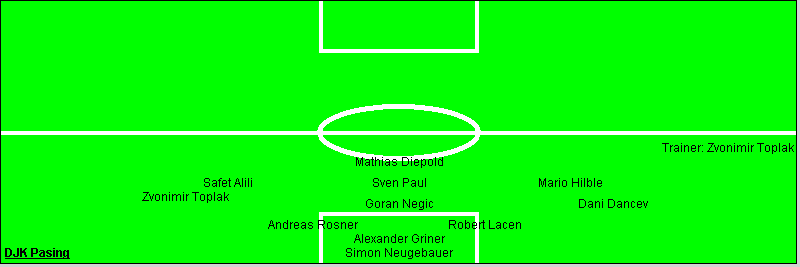 DJK Pasing: Simon Neugebauer - Robert Lacen, Alexander Griner, Andreas Rosner - Dani Dancev (75. Denisz Karatas), Goran Negic, Zvonimir Toplak - Mario Hilble, Sven Paul, Safet Alili (82. Florian Probstmeier) - Mathias Diepold (70. Anton Hartl); Trainer: Zvonimir Toplak Kader: Marko Czok, Helmut Heimerl Tore: 1:0 (50.); 2:0 (60.); 2:1 Denisz Karatas (82.) Am vorletzten Spieltag war die DJK zu Gast beim FC Viktoria. Mit einem Sieg hätte man den Klassenerhalt perfekt machen können. Doch am Ende fährt man mit 0 Punkten nach Hause. Zum Spiel. Die DJK hatte mehr vom Spiel und war in der ersten Hälfte die Spielbestimmende Mannschaft. Doch die wenigen Torchancen blieben ungenutzt. Die Gastgeber kamen einmal gefährlich vor das DJK Tor. Doch sie scheiterten am Pfosten. Nach der Hälfte das gleiche Bild. Doch kurz nach Anpfiff wir die DJK zweimal ausgekontert und fängt zwei Tore. Die letzte halbe Stunde versuchte man alles doch auch die guten Chancen wurden kläglich vergeben. Einzig Karatas schaffte es den Ball im Tor unter zu bringen. Nach dieser Niederlage muss die DJK in der nächsten Woche, um nicht den Schritt in die Relegation machen zu müssen, gewinnen. |